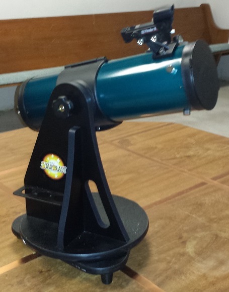 Telescope Dobsonian Orion Orion Starblast tabletop Dobsonian, 4.5 in, f/4, Local Length 450mm F/4, FL 450mm, 6 and 17 mm 1.25 eyepieces, EZ Finder II sight, 13 Lbs, 18in length, blue tube, in shipping box Available - Needs Evaluation