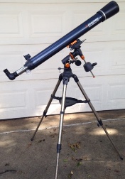 Telescope Refractor Celestron Astro-Master 90EQ MD Refractor, 90mm f/11, Focal Length 1000mm, with CG3 German Equatorial Mount (motor drive) Celestron Astro-Master 90EQ MD refractor with manual german eqiorial mount. 10 & 20 mm eyepieces. Checked Out > 90 Days